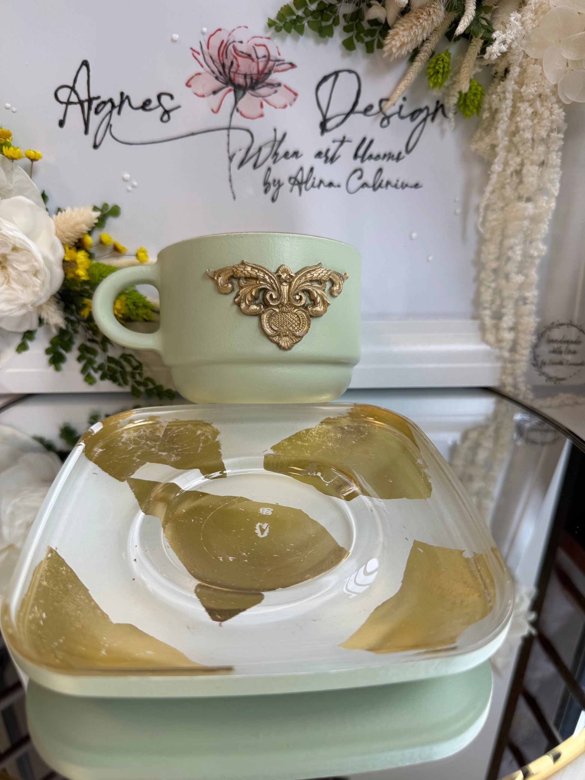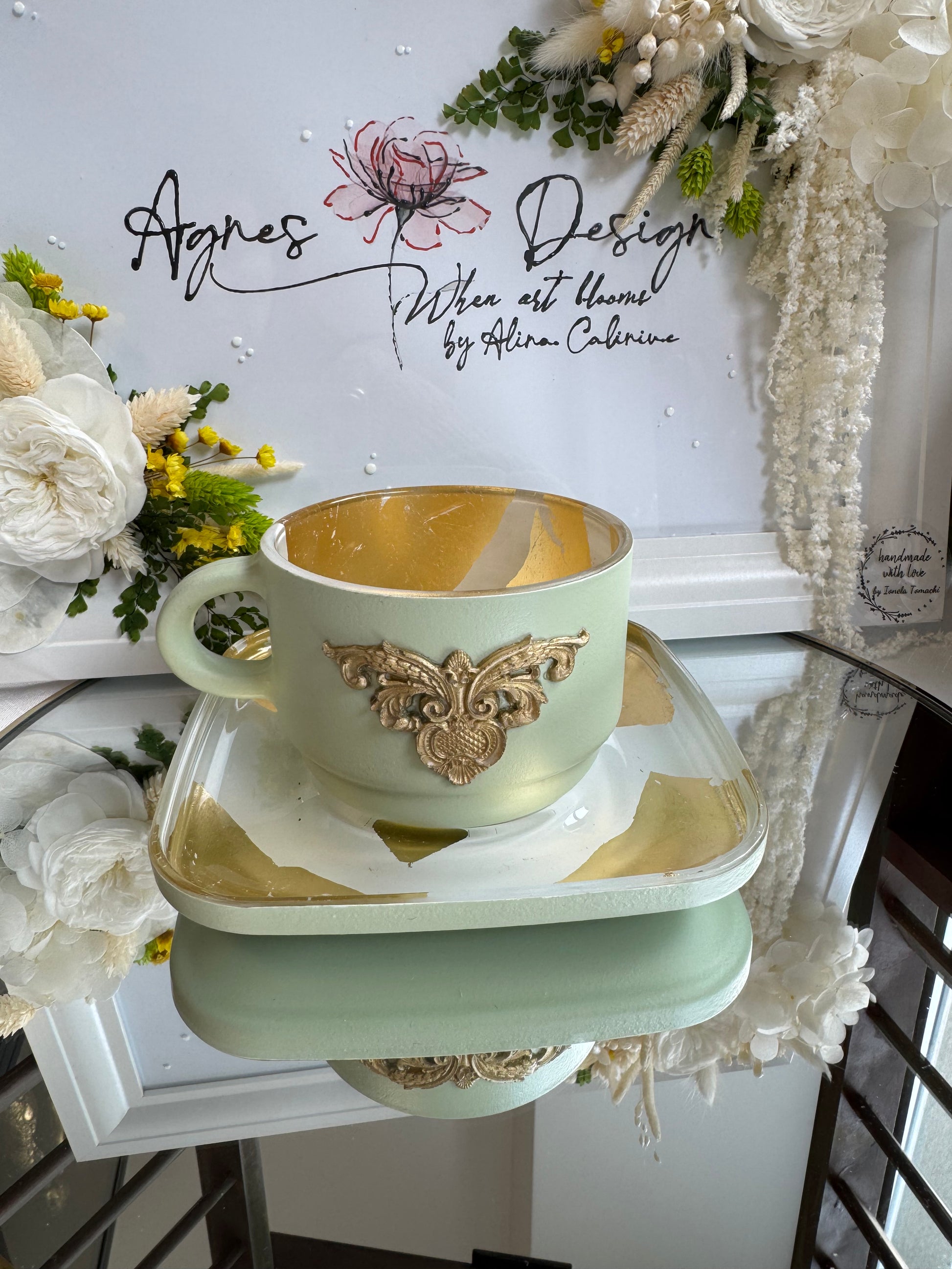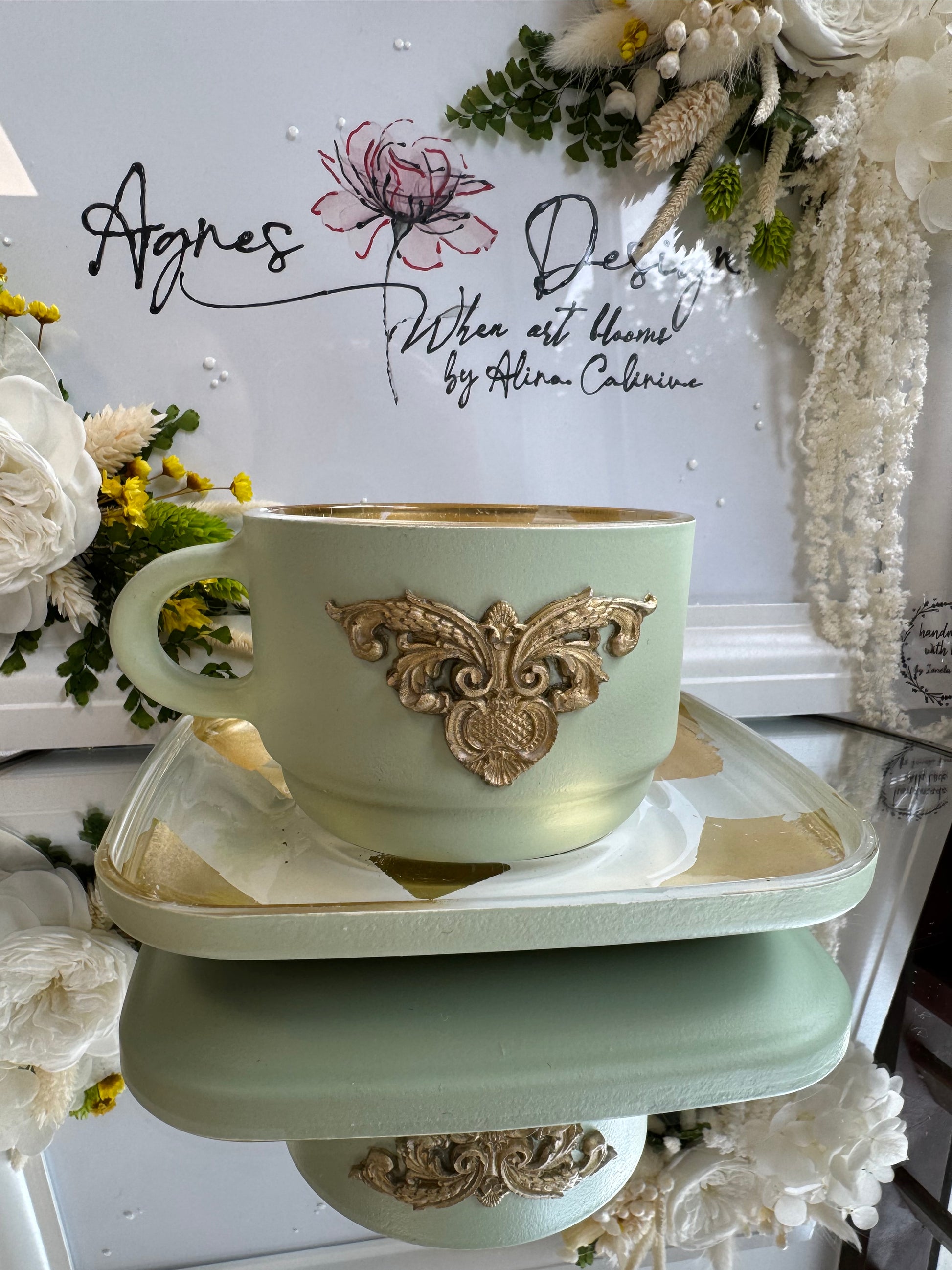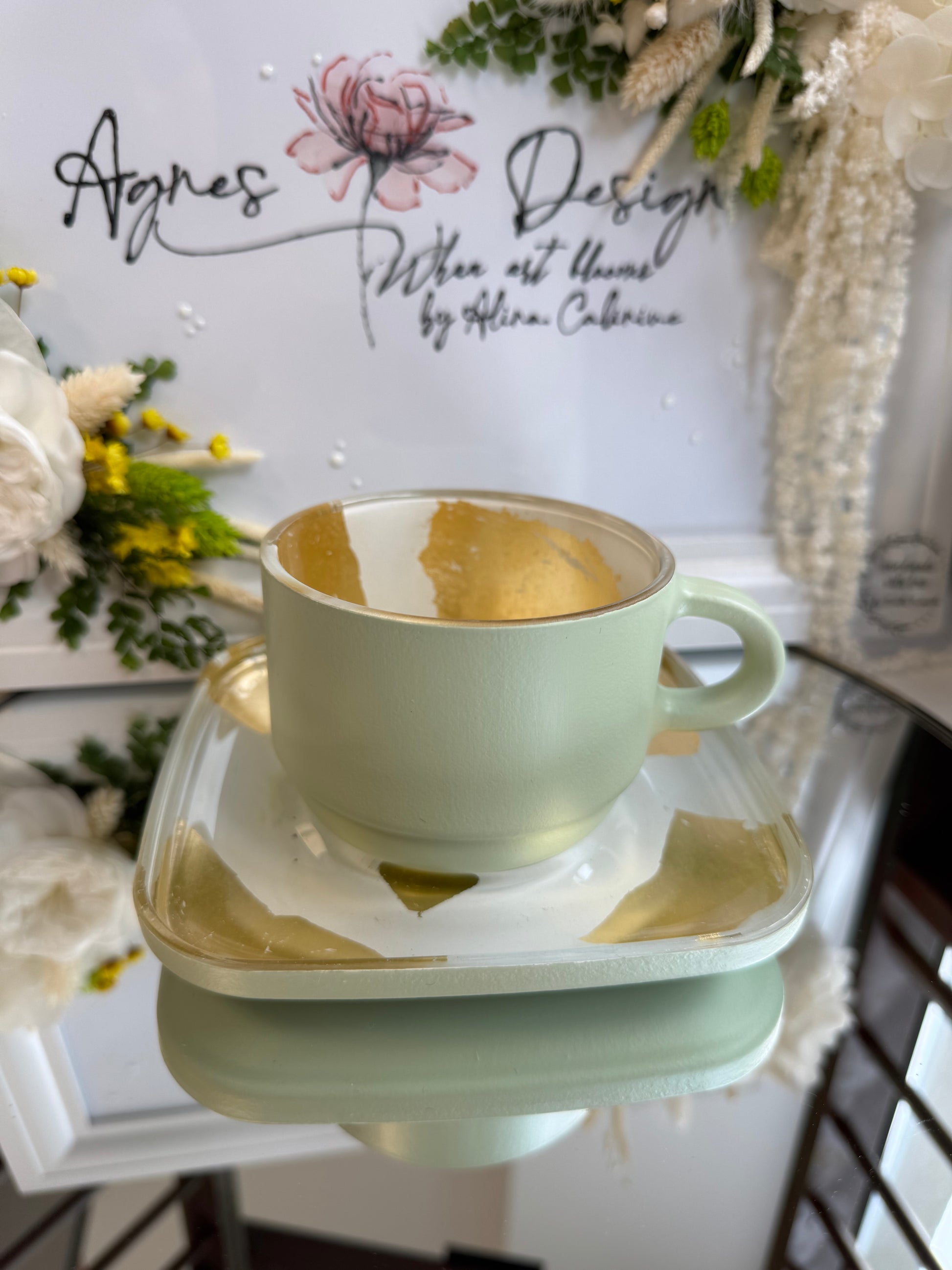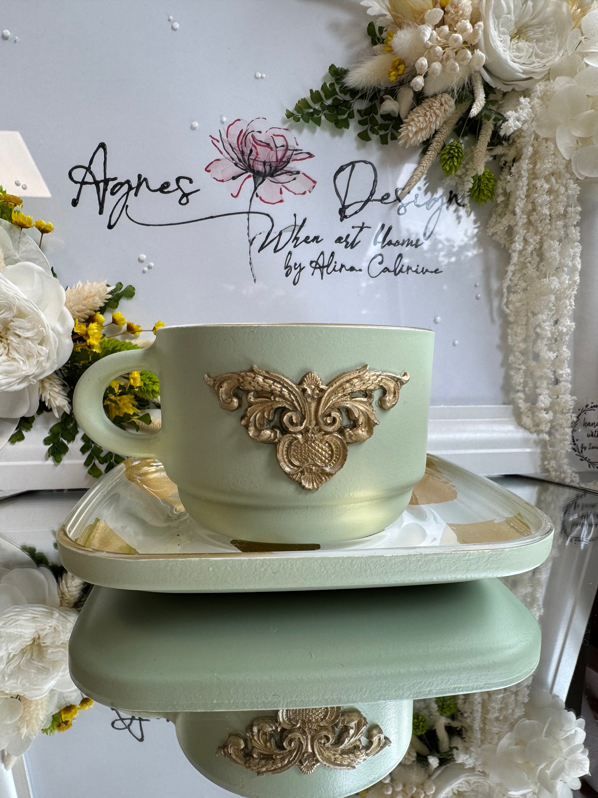 Nuanța vernil, delicată și sofisticată, servește drept fundal perfect pentru strălucirea subtilă și prețioasă a detaliilor aurii. Această cană nu este doar un obiect util, ci o expresie de lux și creativitate, potrivită pentru cei care apreciază frumosul în cele mai mici detalii.