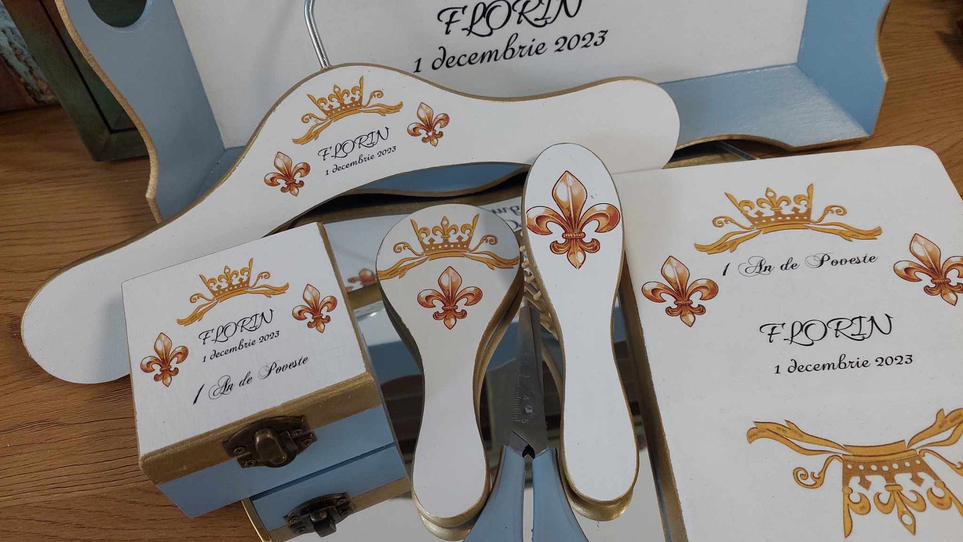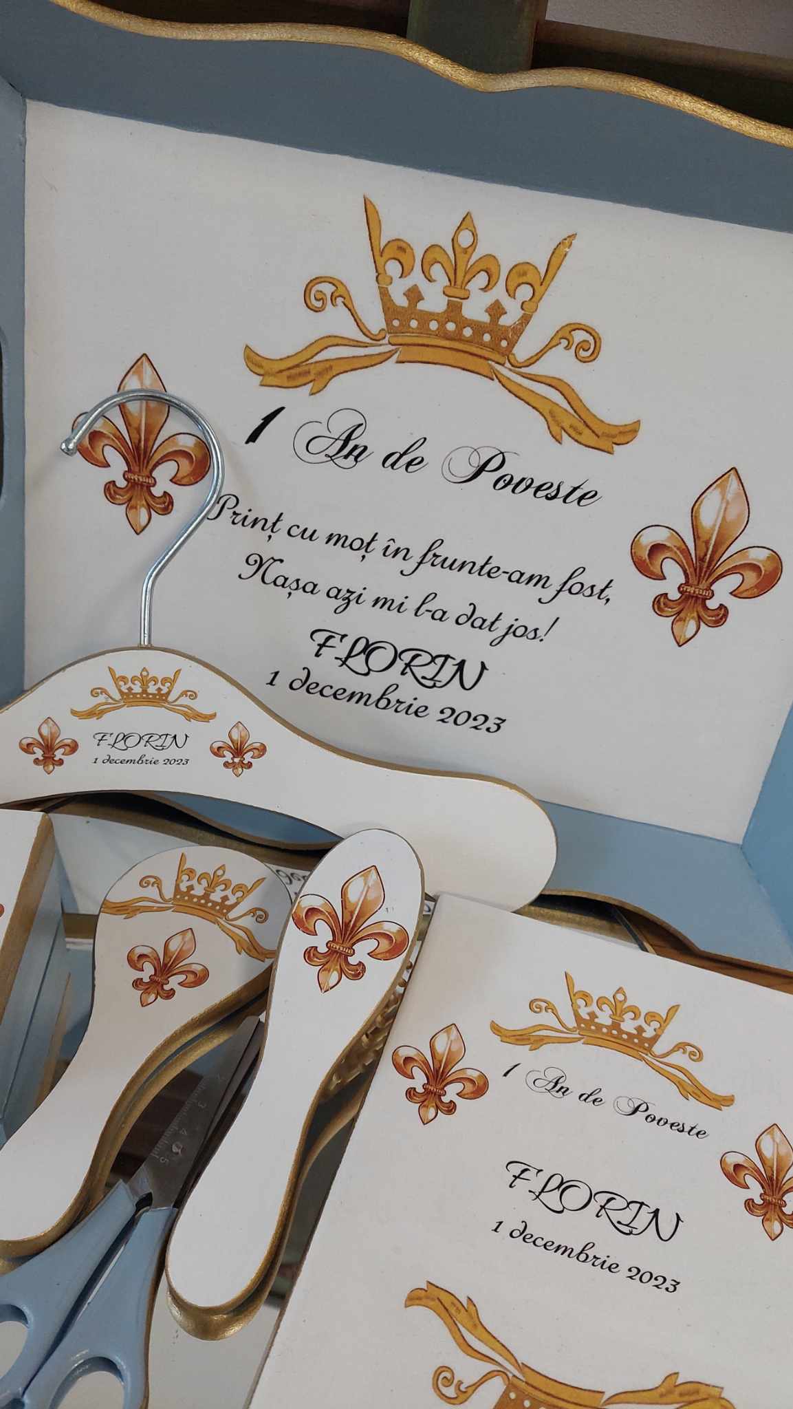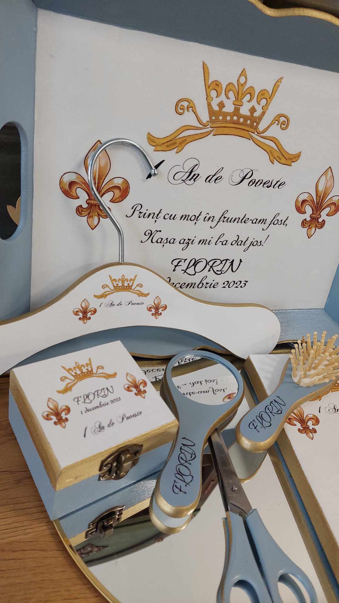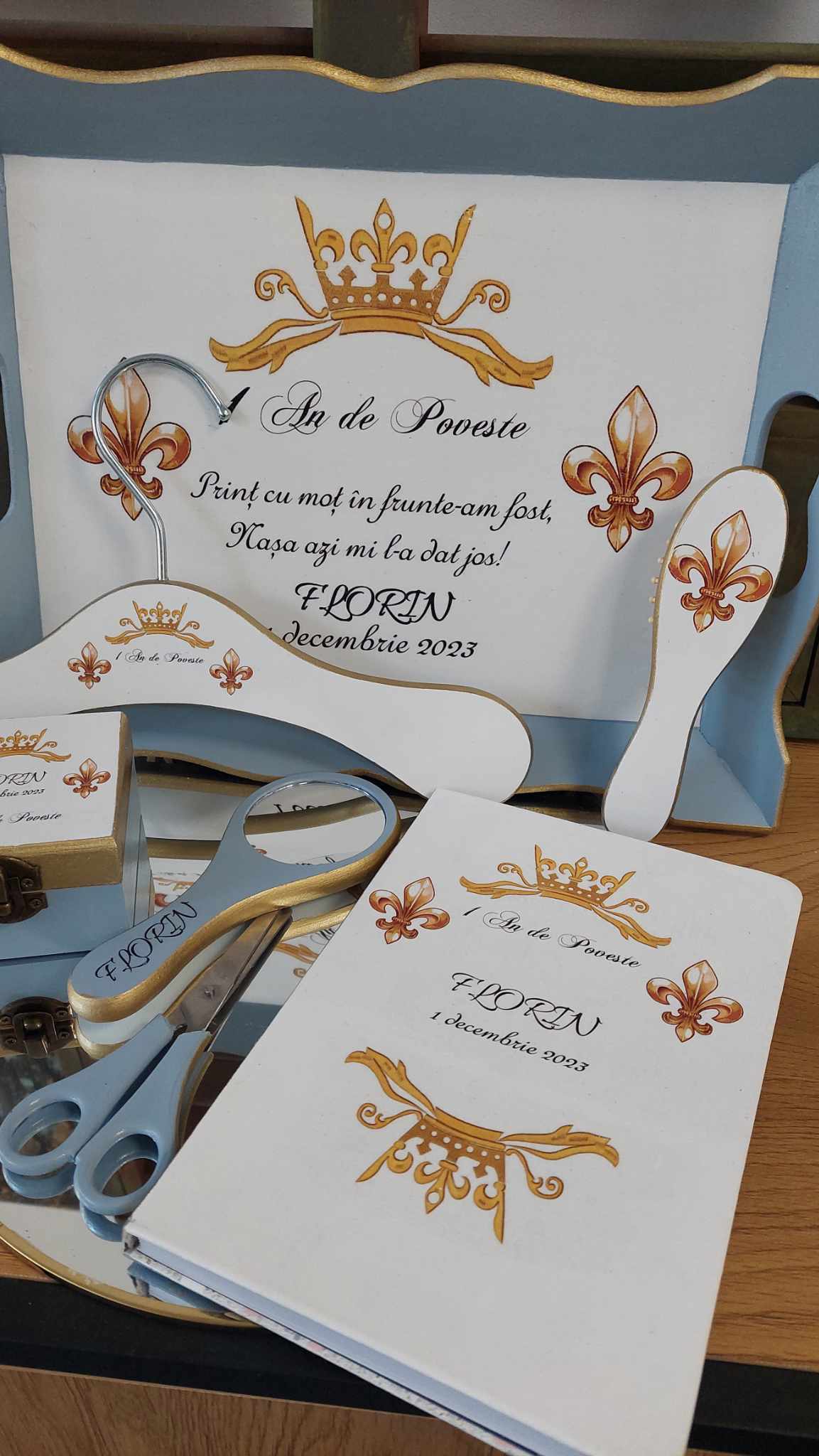 Set pentru prima aniversare cu tematică regală. Produsele sunt lucrate manual, decorate în nuanțe armonioase de auriu și bleu, în Atelierul AgnesDesign.
